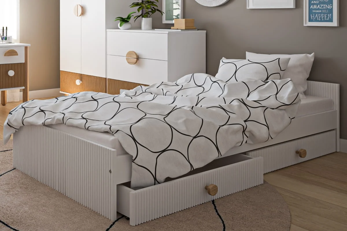Łóżko LOFT to połączenie nowoczesnego designu i przytulnego charakteru, które tworzy idealną przestrzeń do snu i odpoczynku. Jego minimalistyczna forma wprowadza do wnętrza lekkość i harmonię, a delikatne ryflowania na zagłówkach dodają elegancji. Uniwersalne zestawienie bieli z naturalnym drewnem sprawia, że łóżko doskonale pasuje do różnych aranżacji pokoju dziecięcego. Przemyślana konstrukcja zapewnia wygodę i bezpieczeństwo, a możliwość dokupienia praktycznych szuflad pozwala zyskać dodatkowe miejsce na przechowywanie, pomagając utrzymać porządek. To funkcjonalny mebel, który rośnie razem z dzieckiem i przez długi czas pozostaje stylowym elementem wnętrza.