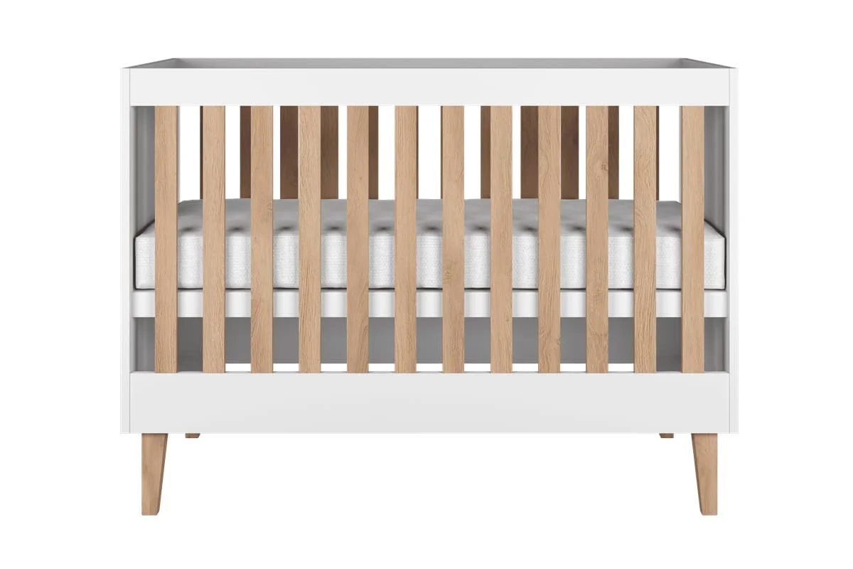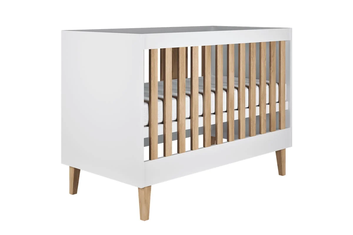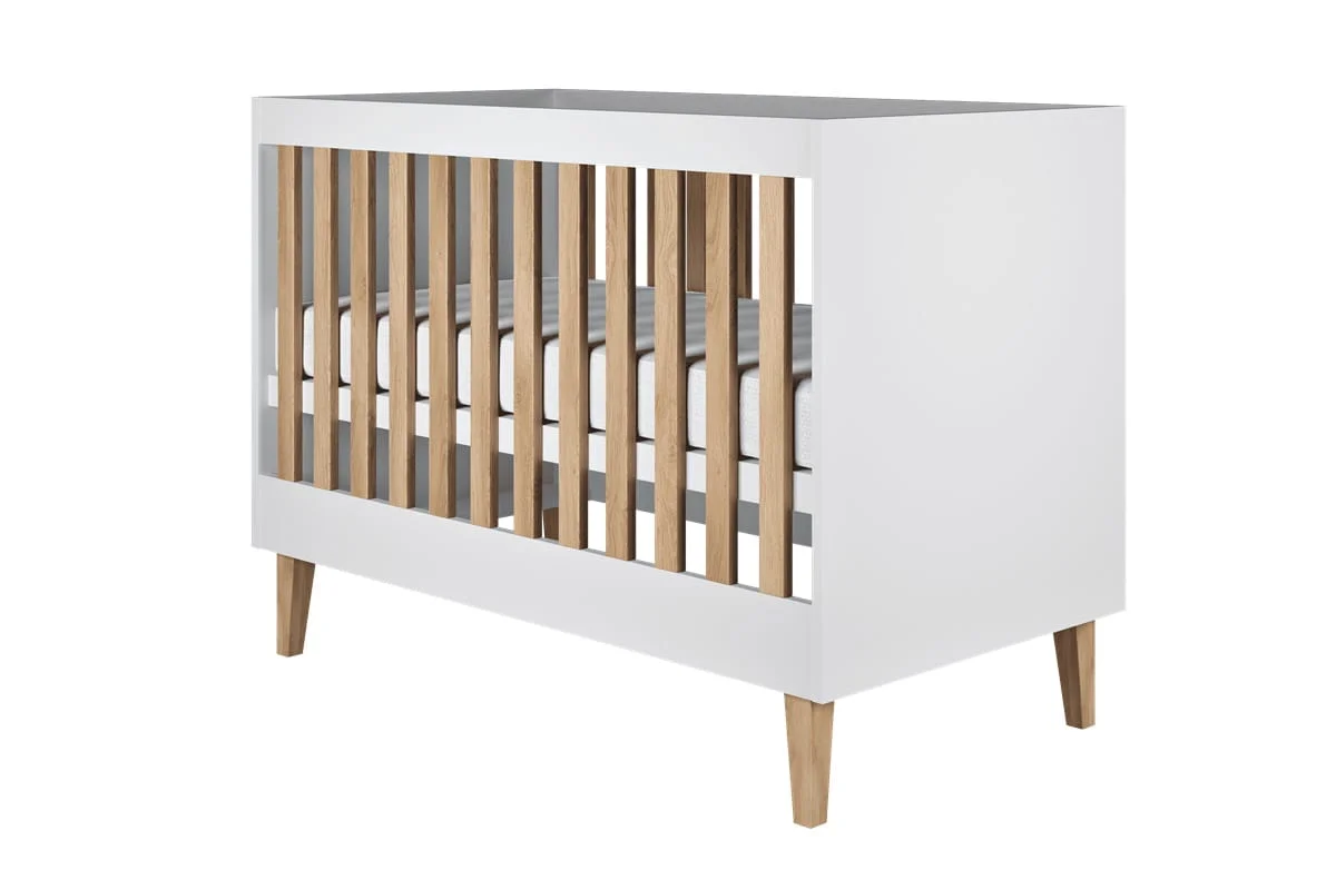 Fronty i elementy łóżeczka w klasycznej bieli tworzą przestrzeń jasną i lekką, która optycznie powiększa pokój i harmonijnie współgra z pozostałymi elementami wystroju. Dębowe nogi i szczebelki wprowadzają ciepły, naturalny akcent, który dodaje łóżeczku przytulności i ponadczasowego charakteru. Takie połączenie bieli i drewna sprawia, że łóżeczko rośnie razem z dzieckiem, zachowując elegancki wygląd przez lata.