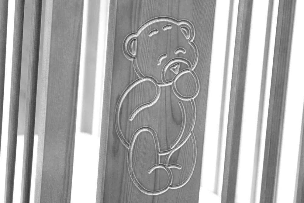 Na bokach łóżeczka znajdziesz uroczy grawer w kształcie misia i chmurki, który subtelnie wprowadza bajkową atmosferę do wnętrza. To drobny akcent, który potrafi wywołać uśmiech na twarzy dziecka i rodzica – dzień po dniu, przez całe dzieciństwo.