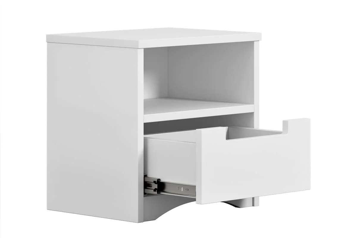 Funkcjonalna konstrukcja: Szafka wyposażona jest w szufladę na prowadnicach kulkowych oraz otwartą półkę, zapewniając wygodne miejsce na książkę, lampkę nocną i drobne przedmioty.