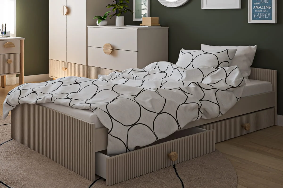 Łóżko LOFT w kolorze kaszmir–buk to połączenie nowoczesnego designu i przytulnego charakteru, które tworzy idealną przestrzeń do snu i odpoczynku. Jego minimalistyczna forma wprowadza do wnętrza lekkość i harmonię, a delikatne ryflowania na zagłówkach dodają elegancji. Subtelne zestawienie odcienia kaszmiru z naturalnym bukiem sprawia, że łóżko doskonale wpisuje się w różne aranżacje pokoju dziecięcego. Przemyślana konstrukcja zapewnia wygodę i bezpieczeństwo, a możliwość dokupienia praktycznych szuflad pozwala zyskać dodatkowe miejsce na przechowywanie, pomagając utrzymać porządek. To funkcjonalny mebel, który rośnie razem z dzieckiem i przez długi czas pozostaje stylowym elementem wnętrza.